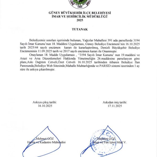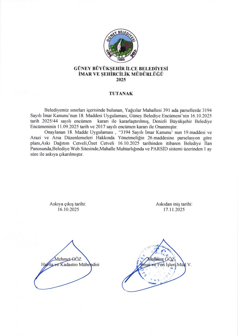 Denizli İli Güney İlçesi Yağcılar Mahallesi 391 ada 29 ve 30 parsellerde kayıtlı taşınmaz üzerinde yapılan 3194 sayılı İmar Kanunun 18.madde uygulaması ve ekleri 30 gün süreyle askıya çıkarılmıştır.İlanen Duyurulur.